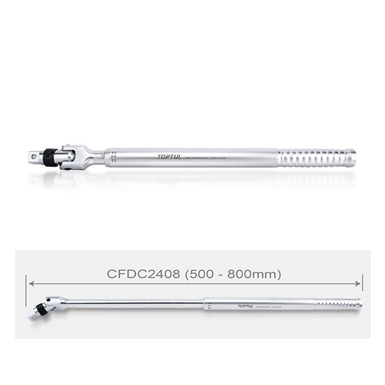 Вороток 3/4" телескопический 500–800 мм с шарниром (с фиксатором) TOPTUL CFDC2408 – мощный инструмент для работы с большой нагрузкой, сочетающий прочность и универсальность. Телескопическая конструкция позволяет регулировать длину от 500 до 800 мм, механизм с фиксатором придает удобство при работе в труднодоступных местах.