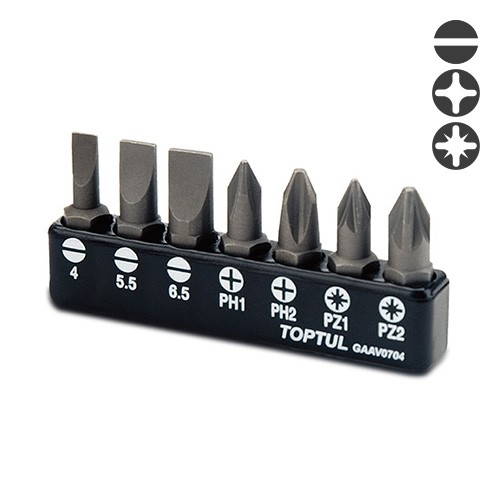 Страна производитель – Тайвань. Набор бит Toptul GAAV0704 выполнен из высококачественных материалов, которые придают им максимальной прочности и надежности. Ассортимент бит предназначен для выполнения наиболее распространенных операций отвинчивания и завинчивания.