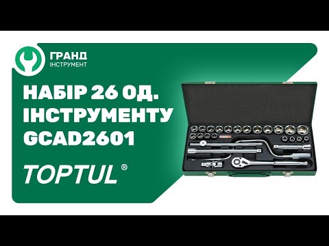 Набор включает в себя: 20 торцевых 6-гранных головок от 10 до 32 мм, кардан, два удлинителя на 125 и 250 мм, вороток с плавающей головкой, коловорот и трещотку на 36 зубцов. Все инструменты в наборе –метрические. Присоединительный квадрат 1/2 дюйма. Данная комплектация обеспечивает высокую функциональность и поэтому делает набор незаменимым помощником для автолюбителя и профессионала. Также есть возможность приобретения ЛЮБОГО инструмента из набора TOPTUL GCAD2601 отдельно.