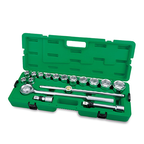 Комплектация набора: 13 торцевых 6-гранных головок от 19 до 50мм, удлинителя с фиксацией размером 100 и 200мм, вороток с плавающей головкой и трещотка на 43 зубца.