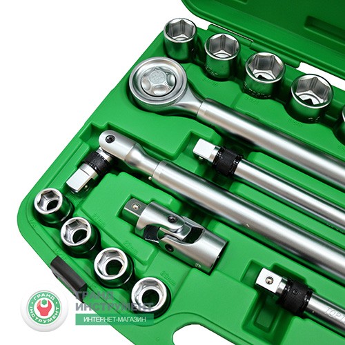 В данный набор включены: 16 торцевых 6-гранных головок от 19 до 50 мм, два удлинителя с фиксацией размером 200 и 400 мм, кардан, вороток с шарниром с фиксацией и трещотка на 24 зубца с удлинителем 500мм.