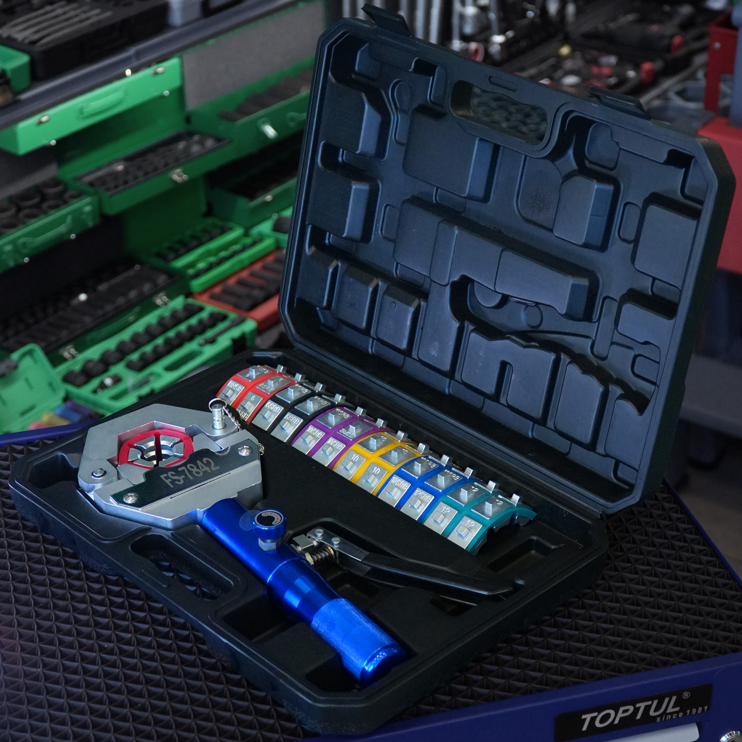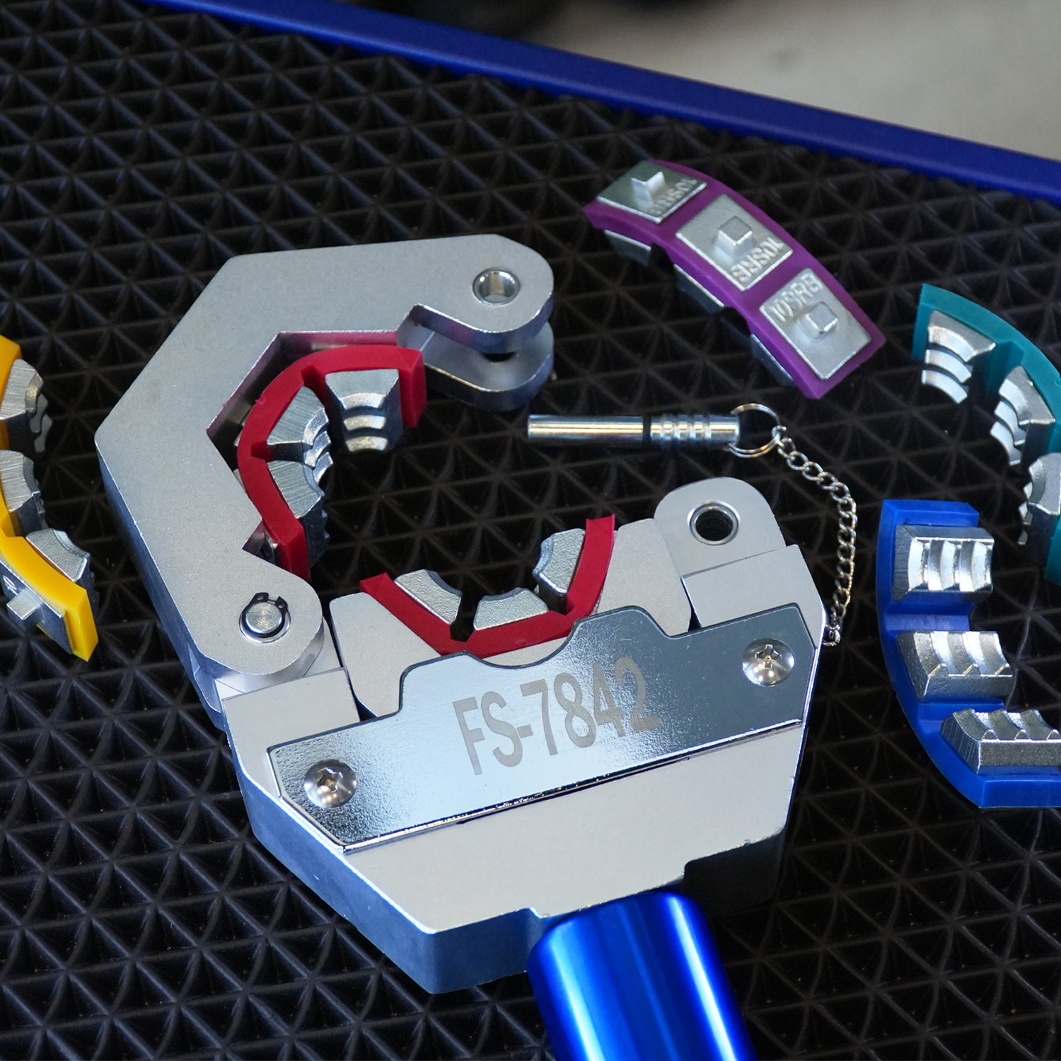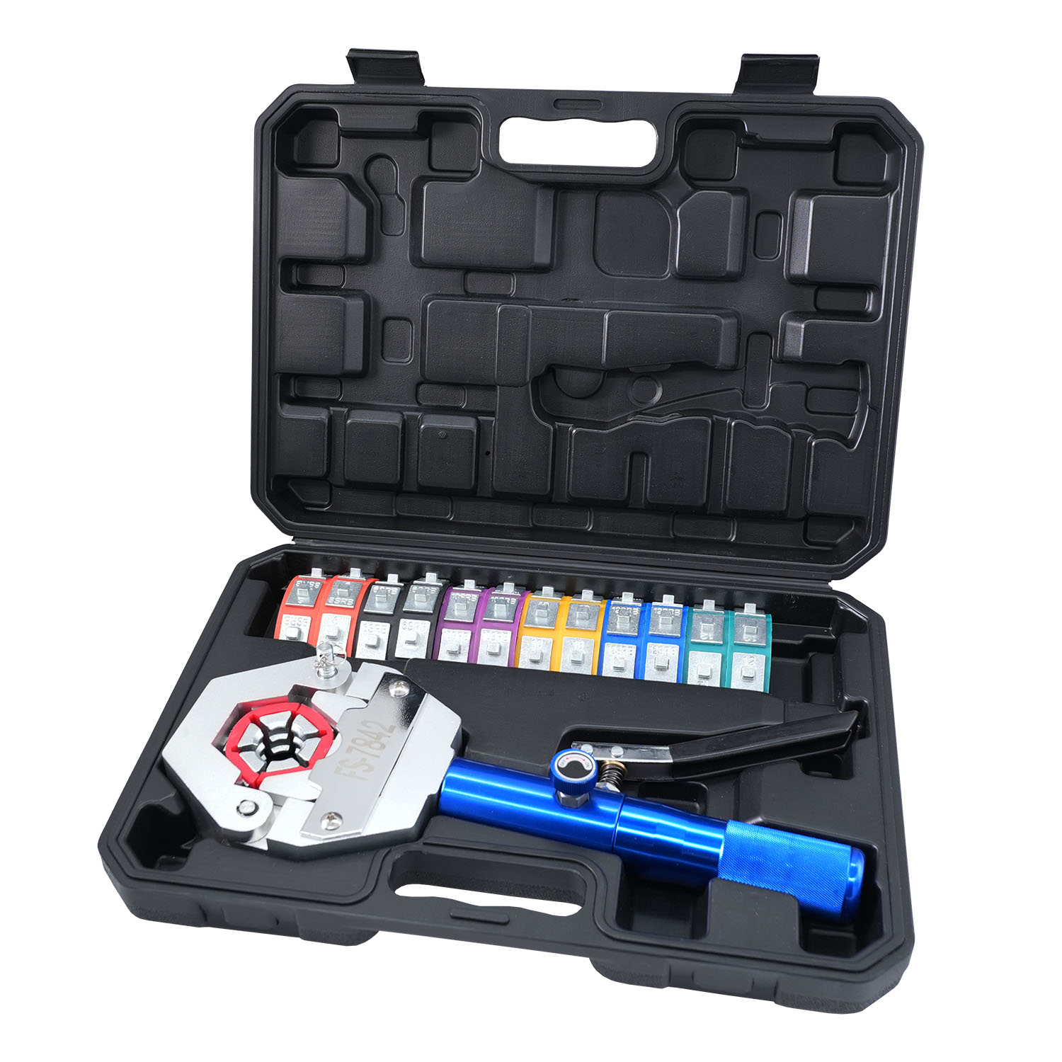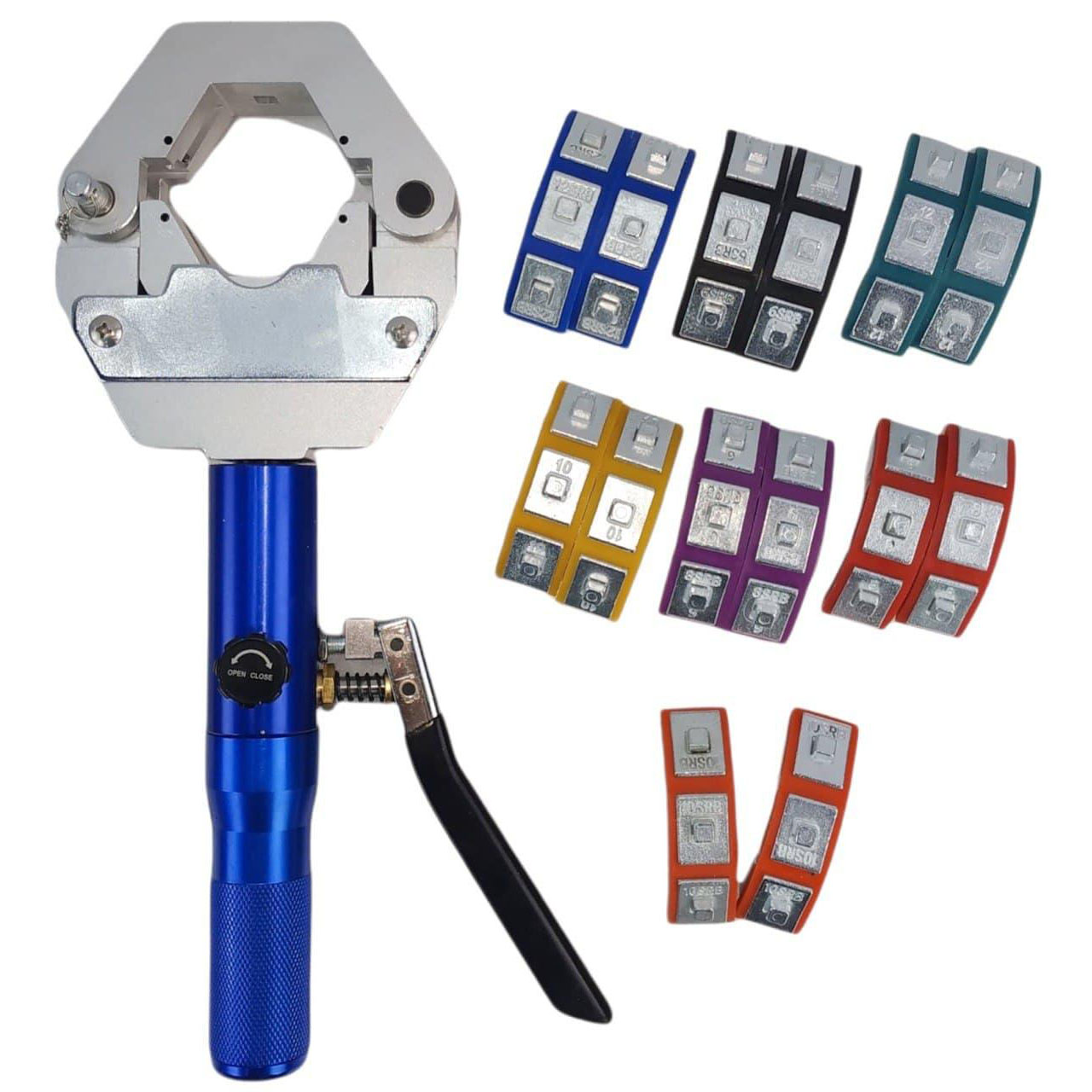 Комплект поставки включает в себя ручной гидравлический крымпер, набор из семи стандартных сменных насадок (матриц), каждая из которых имеет собственный цвет и маркировку диаметра для быстрой идентификации под соответствующий шланг.