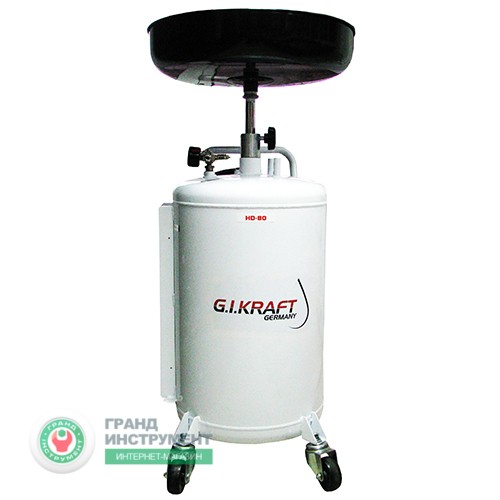 Установка для слива мастила 80л G.I.KRAFT HD-80. Регулировка высоты чаши для слива отработанного мастила. Большой диаметр сливного чана, предотвращает проливание мастила. Для слива мастила с накопительного бака используется давление воздуха. Объем резервуара для хранения извлекаемой жидкости - 80 литров.