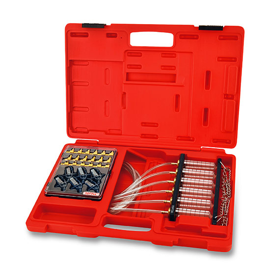 Набор для проверки обратного потока топлива дизельных форсунок Common Rail TOPTUL JGAI2501 – профессиональный инструмент для быстрой и точной диагностики состояния форсунок в дизельных двигателях с системой Common Rail. Позволяет определить неисправные, изношенные или заблокированные форсунки путем измерения количества возвращаемого топлива в сливной бак.