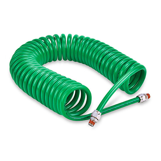 Профессиональный спиральный полиуретановый шланг от TOPTUL, модель KHLC08150, предназначен для высокопроизводительных пневматических систем, компрессоров и пневмоинструмента. Изготовлен из ультралегкого полиуретана с интегрированным плетением из полиэфирной нити, что обеспечивает высокую прочность на растяжение.