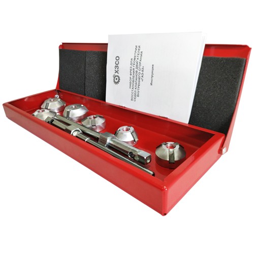 Набор состоит из режущего инструмента – фрез (шарошек), с различными диаметрами и углами, а также направляющего стержня (пилота). Набор фрез позволяет обрабатывать фаски седел клапанов, двигателей автомобилей семейства «ГАЗ-53», обеспечивая следующие углы, рекомендованные заводом изготовителем: A 45º, B 30º, C 30º.