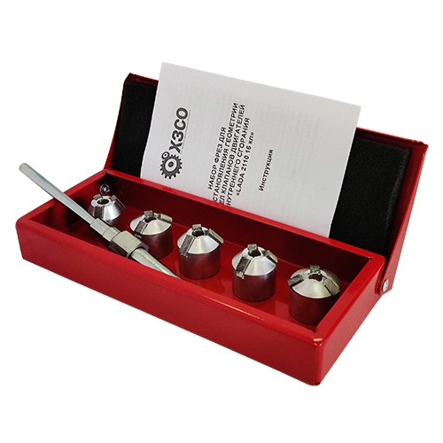 Набор состоит из режущего инструмента – фрез (шарошек), с различными диаметрами и углами, а также направляющего стержня (пилота). Набор фрез позволяет обрабатывать фаски седел клапанов, двигателей автомобилей семейства LADA 2110 16 кл, обеспечивая следующие углы, рекомендованные заводом изготовителем: