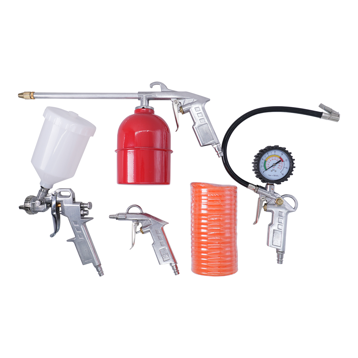 - Спіральний повітряний шланг 5м — забезпечує гнучке з'єднання з компресором.