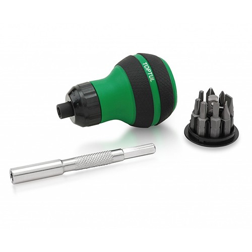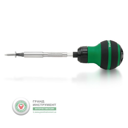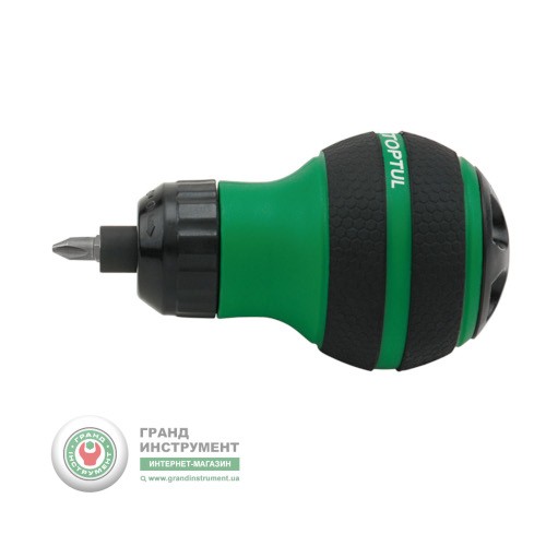 Викрутка бітотримач з тріскачкою міні 9 в 1 GAAR1101 TOPTUL . У своїй комплектації має 8 різних насадок (SL4; SL5,5x1; SL6,5x1,2; PH1; PH2; TORX T15-T25), подовжувач 90мм і перехідник з шестикутника на квадрат 1/4 дюйма. Це дає можливість використовувати викрутку в якості тріскачки, для роботи з торцевими головками з приєднувальним квадратом 1/4 дюйма.
