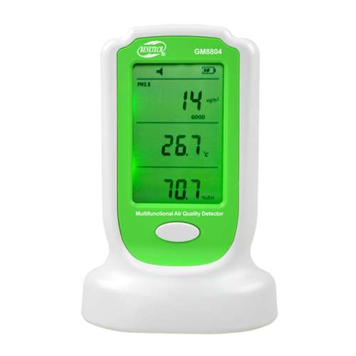 GM8804 - портативний аналізатор концентрації формальдегіду і твердих частинок виробництва компанії Benetech. Призначений для контролю якості повітря, концентрації формальдегіду і детектування твердих дрібнодисперсних частинок, пилу і інших включень в складі повітря. Використовується на виробництві, в офісних приміщеннях, медичних, освітніх установах, в місцях тривалого перебування людей. Прилад має два канали для аналізу твердих дрібнодисперсних частинок: до 10 мкм і до 2,5 мкм і канал вимірювання концентрації формальдегіду. Відмінною рисою даного портативного настільного аналізатора GM8804 є висока точність вимірювання, великий дисплей, на якому відображається концентрація частинок розміром до 2,5 мкм та до 10 мкм, концентрація формальдегіду, температура і вологість повітря. Також реалізована колірна сигналізація зон допустимої концентрації. Робота аналізатора GM8804 заснована на технології лазерної фотометрії розсіяного світла. Мінімальний дозвіл розміру часток 0,3 мкм. Живлення аналізатора забезпечують три акумулятора типу ААА (NiMH) .Чому потрібно контролювати концентрацію формальдегіду? Формальдегід дуже токсичний. Смертельна доза формальдегіду становить від 60 до 90 мл. Симптоми отруєння формальдегідом: блідість, занепад сил, несвідомий стан, судоми, важке дихання, головний біль. Інгаляційне отруєння викликає гострий бронхіт, набряк легенів, ураження нервової системи. Небезпечна середньодобова концентрація формальдегіду становить 0,01 мг / м3.