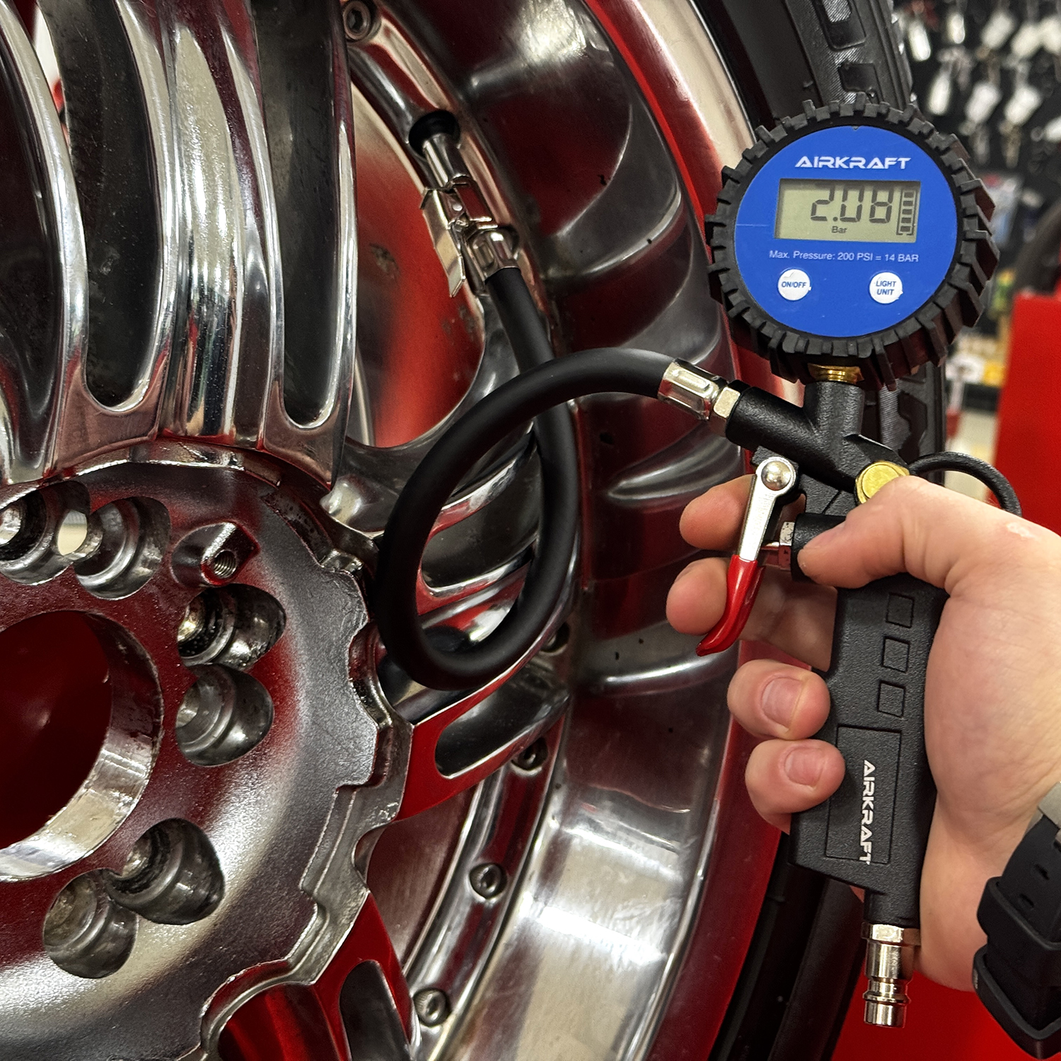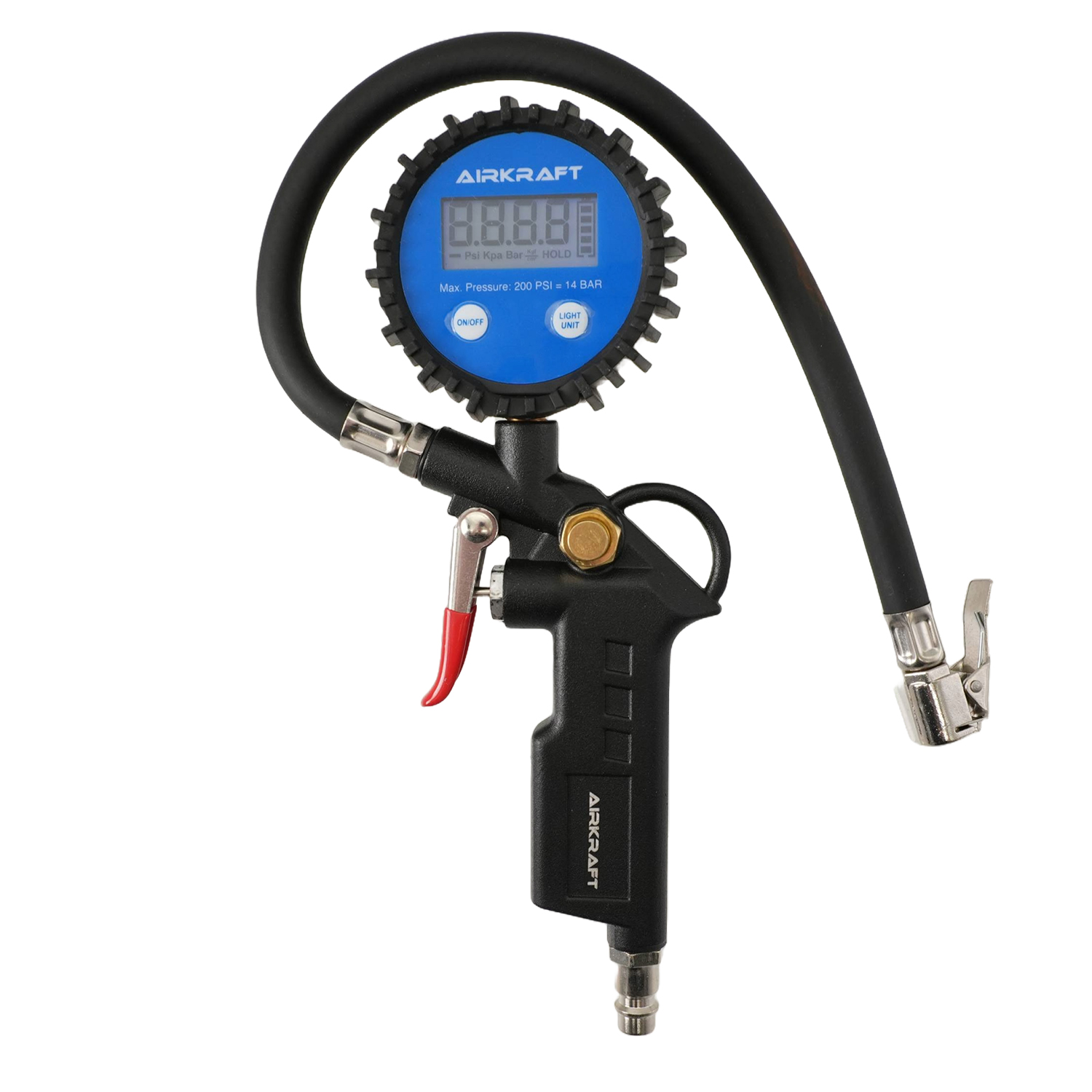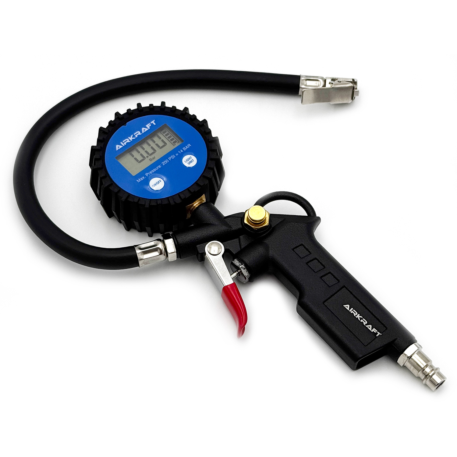 Пістолет для підкачування коліс із цифровим манометром AIRKRAFT STG-05D — це професійний інструмент, призначений для точного вимірювання та регулювання тиску в шинах автомобілів, мотоциклів та інших транспортних засобів. Завдяки вбудованому цифровому манометру, пристрій забезпечує швидке та точне відображення показників тиску, що сприяє підтриманню оптимального стану шин.